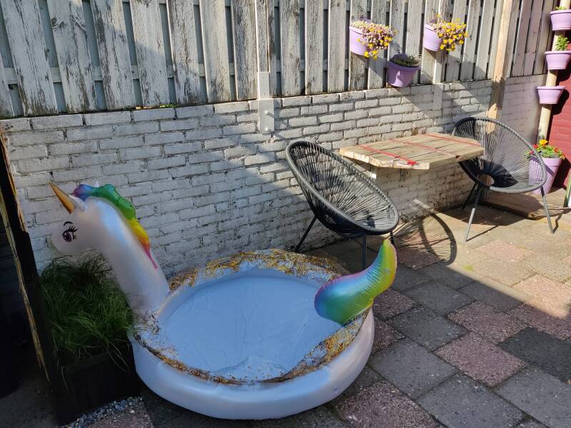 Wat een heerlijke start van de zomer met echt zomers weer! Van de stilte genoten, lekker en fijn kunnen mediteren. Vandaag het zwembadje voor Milo opgezet, waar hij meteen dankbaar gebruik van maakte 😊 Tijdens het klaar maken van de tuin en het opblazen en vullen van het badje, was hij al helemaal blij en kwispelend aan het rondwandelen met zijn favoriete bal in zijn mond. Zo cute! 😍 Op de foto hieronder staat het zwembadje van de afgelopen twee jaar, omdat de tuin er nu zo triest bijligt door de renovatie, dat ik deze foto veel leuker en zomerser vind… 😉 Het badje dat Milo nu heeft, is een saaie blauwe dat wèl voldoet om af te koelen. Volgend jaar zetten we de gezelligerd van onderstaande foto leuk weer op! Mijn nichtje van toen 6 wilde vorig jaar ook heeeeel graag komen 'zwemmen' in het unicorn-badje 😍